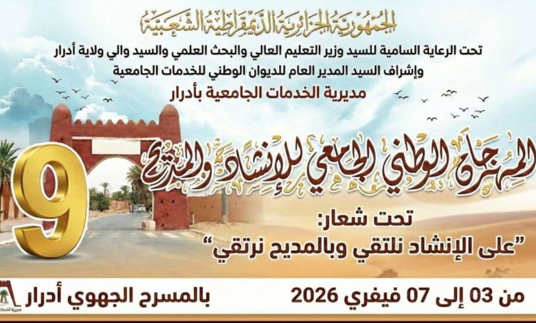 Plus de 300 étudiants, représentant différentes institutions universitaires du pays, animent la 9ème édition du Festival national universitaire d’Inchad et de Madih (chant religieux), ouverte mercredi à Adrar, sous l’égide de l’Office national des œuvres universitaires.