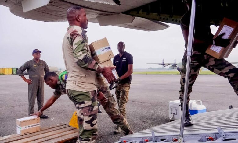 Les premières cargaisons ont été acheminées par un avion des forces armées gabonaises, le pays ne disposant pas d’une compagnie aérienne nationale.