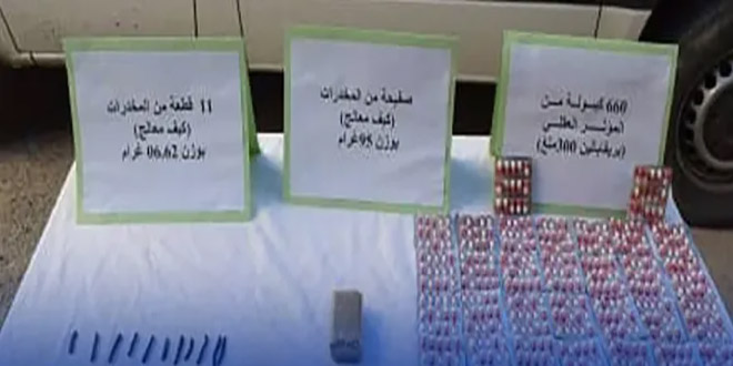D’après le communiqué, l’opération a permis la saisie de 101,62 grammes de kif traité ainsi que 660 capsules hallucinogènes de type “Prégabaline 300 mg”. Cette saisie fait suite à une enquête approfondie sur l’activité d’un groupe de personnes impliquées dans le transport et la distribution de ces substances à bord d’un véhicule de tourisme.
